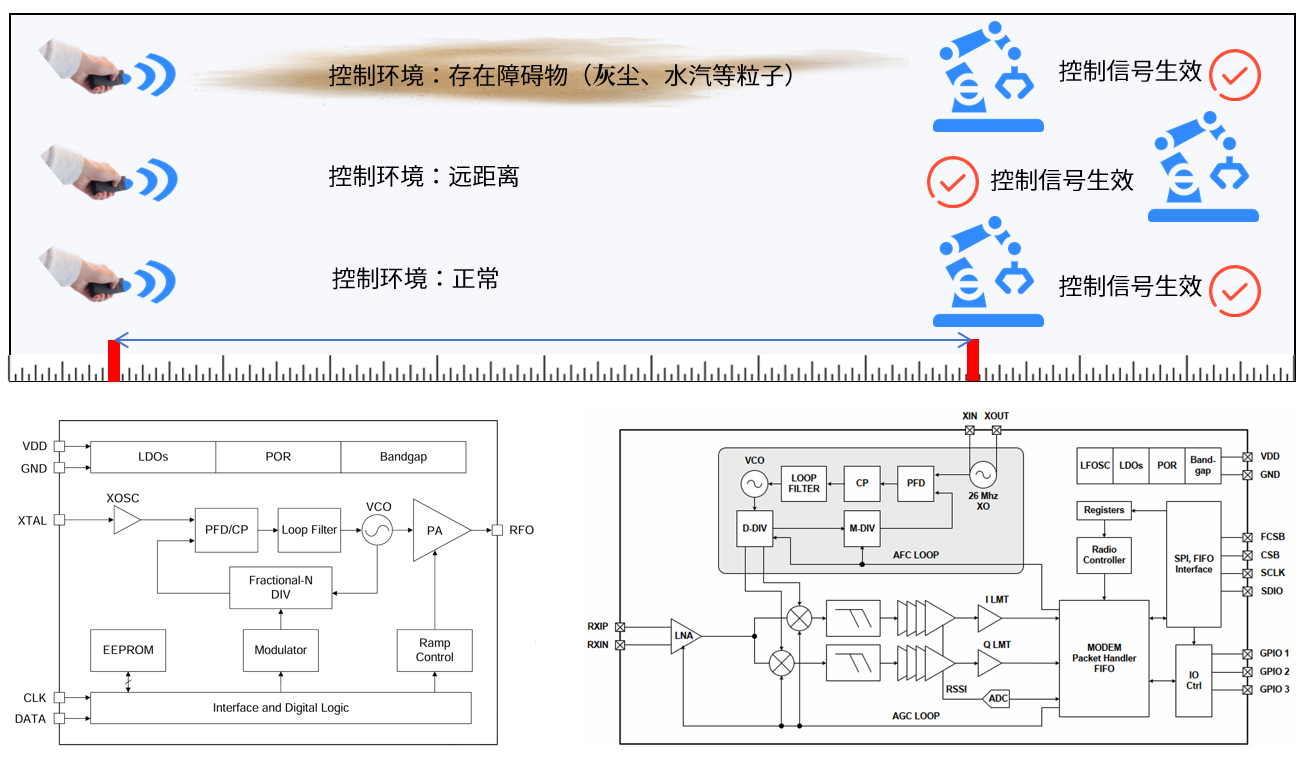 其中,无线射频作为一种具备远距离传输、抗干扰能力强与技术成熟度高等优势的无线通信技术,尤其是在Sub-GHz频段下,其低功耗、强穿透与广覆盖的特性进一步凸显,是在各种复杂工业环境中实现高可靠性的无线遥控方案之一。