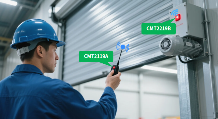 如下图所示,某卷帘门无线遥控方案的发射端就选用了无线发射芯片CMT2119A;而接收端则选用无线接收芯片CMT2219B,通过解调遥控指令输出给电机以开启卷帘门或关闭卷帘门。