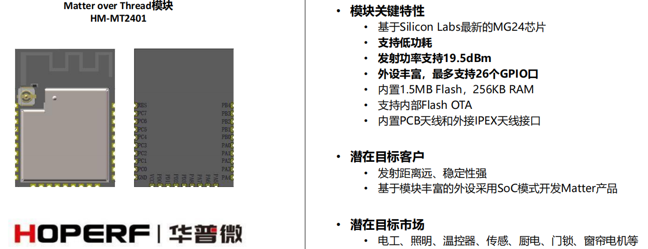 例如,350VIP浦京微自主研发的HM-MT2401就是一款基于2.4GHz频段的Matter over Thread无线通信模块,其已被广泛应用于LED灯具、智能开关、智能插座、智能门锁、智能窗帘电机、智能门铃、智能温控器及智能传感器等众多智能家居设备之中。