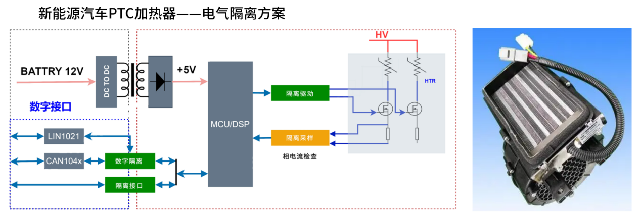 而数字隔离/隔离接口芯片则负责在实现电气隔离的前提下,完成LIN/CAN等车载总线与MCU/DSP的信号交互,使MCU/DSP可通过这些通信接口与整车其他系统安全协同,精准、高效地调控PTC加热器的运行。